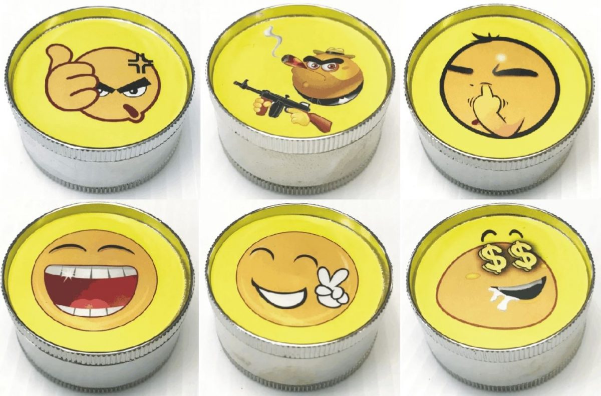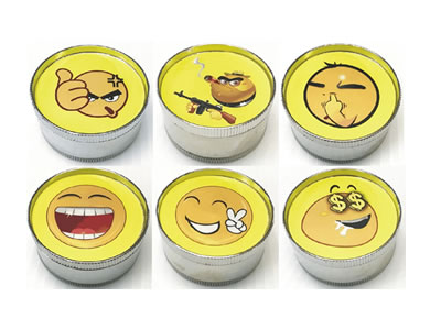 #GR3EMOJI Metal Grinder Assorted Emoji Designs 2″ Diameter; 1.2″ Tall 12 pcs/Tray | $5.50/pc