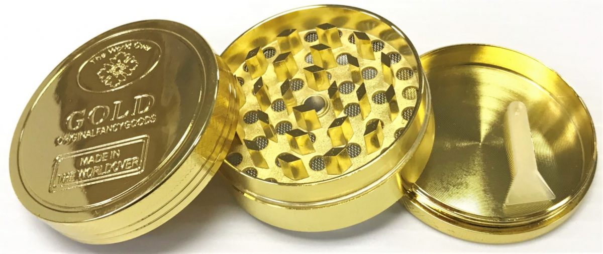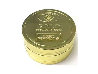 GR3GOLD Metal Grinder W/ Scoop Gold Coin Design 2″ Diameter ; 1″ Tall 12 pcs/Tray | $5.50/pc